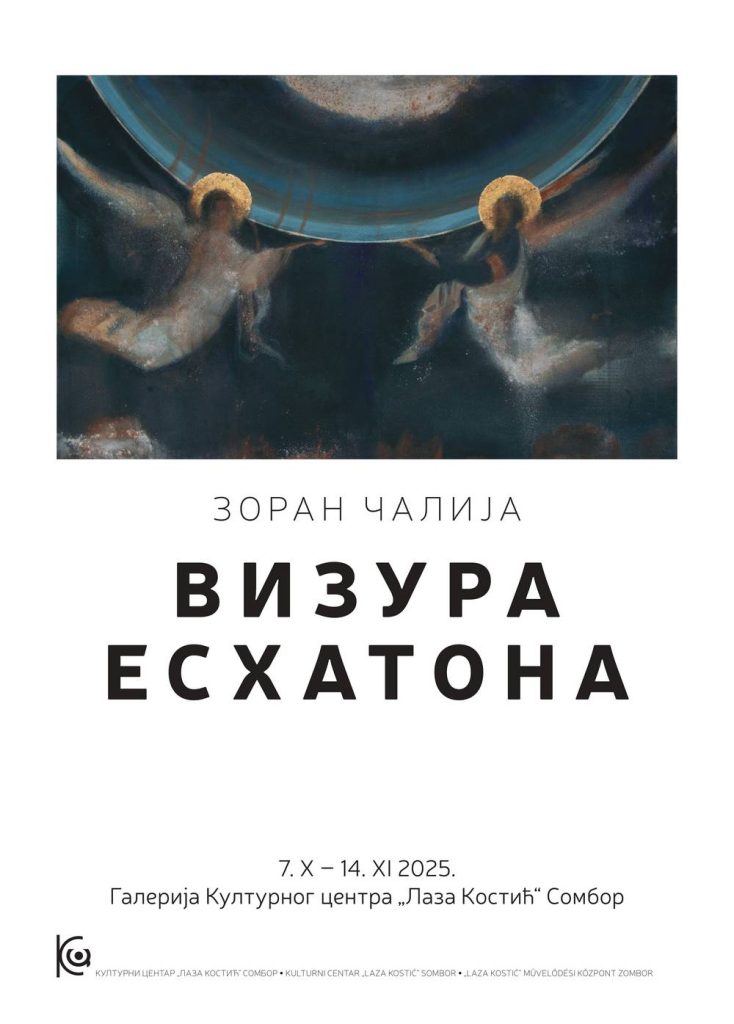 Poštovani, U utorak, 7. oktobra, u Velikoj galeriji Kulturnog centra “Laza Kostić” Sombor, biće upriličeno svečano otvaranje izložbe “Vizura Eshatona”, umetnika Zorana Čalije, s početkom
