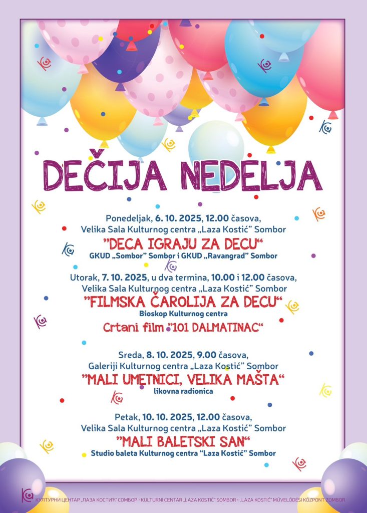 Draga deco i roditelji, spremite se za dane pune smeha, igre, kreativnosti i čarolije! Kulturni centar „Laza Kostić“ Sombor otvara svoja vrata najmlađima i priprema